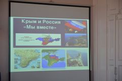 Студенты узнали о событиях, предшествовавших присоединению Крыма к России, также была затронута тема «крымской нации» — пожалуй, именно так можно назвать всех тех, кто называет себя крымчанами, независимо от национальности, вероисповедания и взглядов, ведь Крым — это регион, где на протяжении веков всё смешивалось и роднилось, умиротворяясь удивительной природой и климатом полуострова. На гербе Республики Крым написано «Процветание в единстве!», а это значит, что только под мирным небом и в содружестве всех наций мы сможем сделать нашу землю процветающей и богатой.