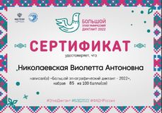 Цель VII Международной просветительской акции - привлечь внимание людей к истории, культуре и традициям народов, населяющих страну. Это знание способствует укреплению согласия, межэтнического мира и национального единства народов Российской Федерации, а также поднимает уровень этнографической грамотности населения. Текст Диктанта включает в себя 30 тестовых заданий: 20 федеральных вопросов и 10 региональных (про Карелию). Максимальная сумма баллов за Диктант – 100. За участие в акции студенты получили сертификаты. Выражаю благодарность студентам и преподавателям за участие в акции «Большой этнографический диктант».